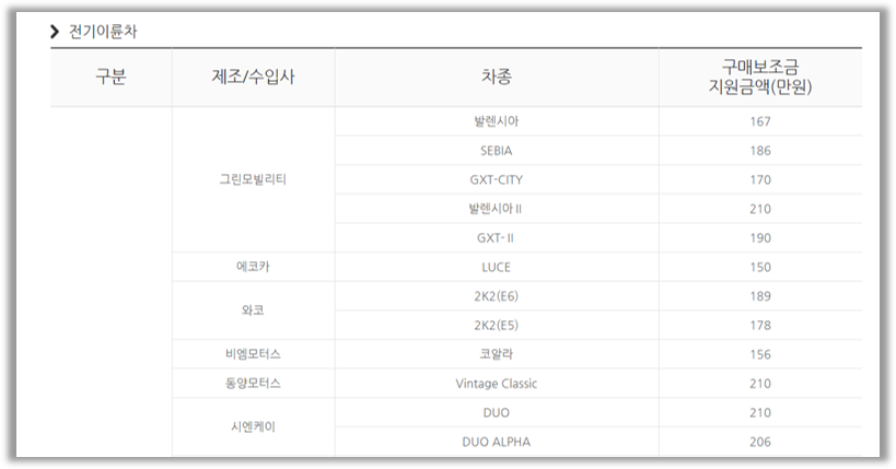 다음은 전기이륜차의 경우입니다. 그린모빌리티, 에코카, 와코, 비엠모터스, 동양모터스, 시엔케이 등등의 제조사, 수입사에서 전기차를 구매했을 경우 100만원에서 200만원 정도의 보조금을 받을 수 있습니다.