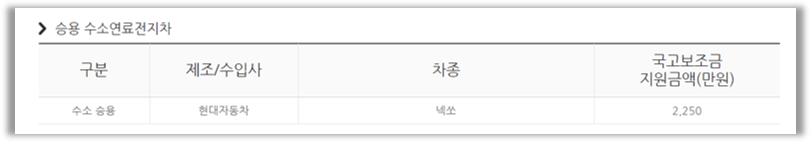 승용 수소연료전지차의 경우입니다. 현대자동차 제조사의 넥쏘를 구입할 경우, 2,250만원의 보조금을 받을 수 있습니다.